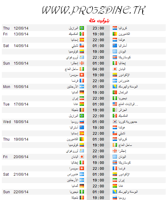 جدول مواعيد مباريات كأس العالم 2014 موعد توقيت مباريات مونديال البرازيل بتوقيت مكة المكرمة . المجموعات : مواعيد مباريات :
